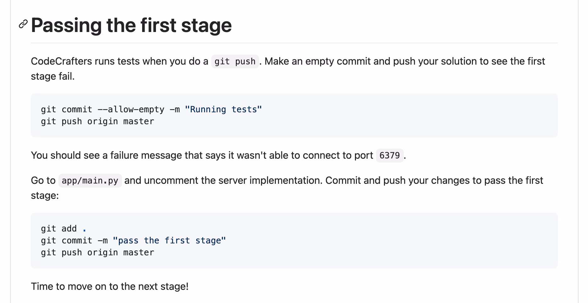 The README will contain instructions on how to pass the first stage. We always include this along with your starter repository, so that it’s easy to get started.