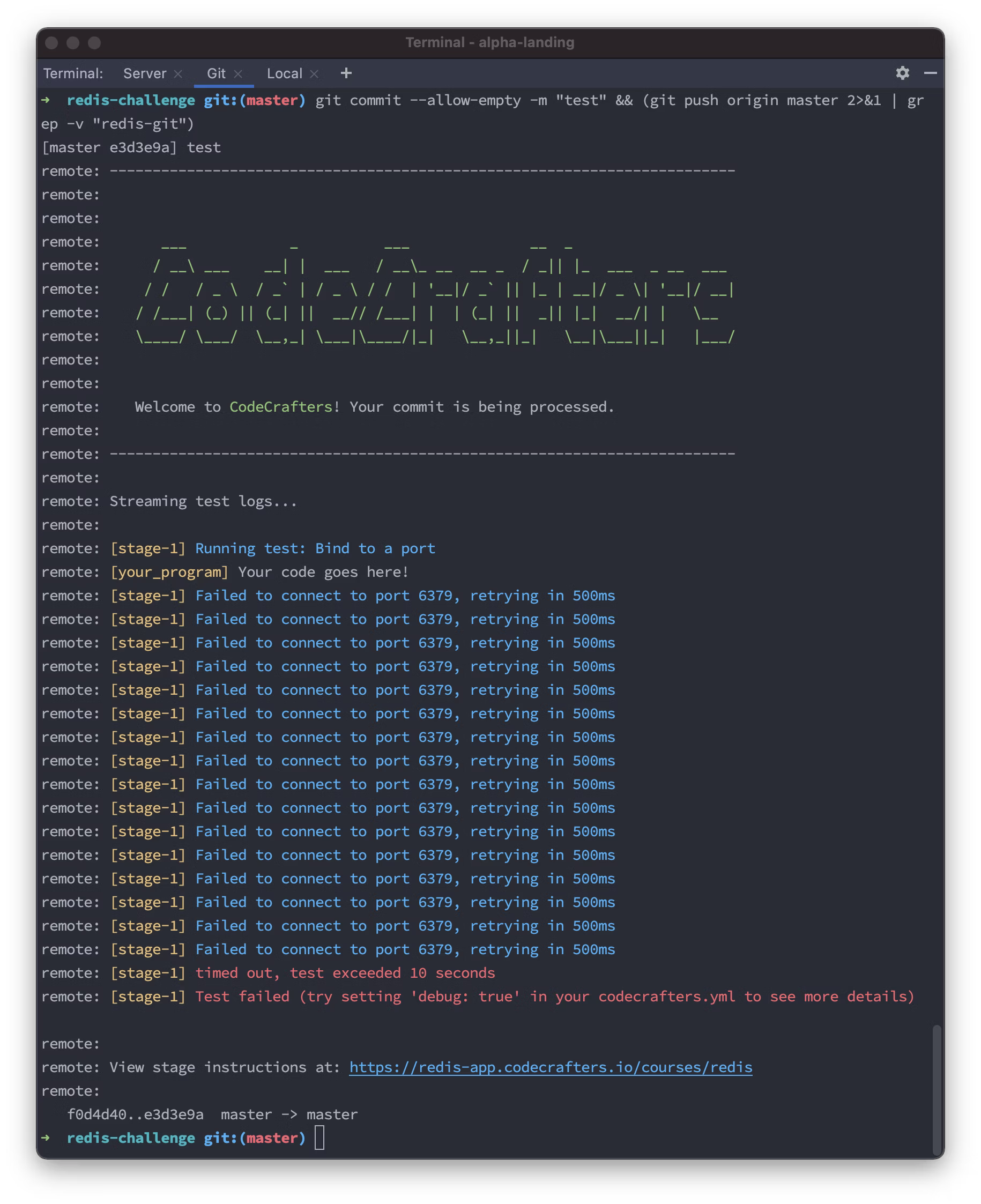 First off, we’ll create a git repository for you. Like this one. You’ll use this repository to submit code to CodeCrafters to run tests. You can choose what language to use at this point. You can freely switch between languages whenever you want.